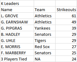 5. George Blaeholder, St. Louis Browns (Prev: NR) (10 games, 4 starts, 4-1, 2.14 ERA, 1.08 WHIP, 7 Ks; Other highlights: 2 CG) - A jack of all trades pitcher for the Browns, Blaeholder can start or come on in relief to get a win.